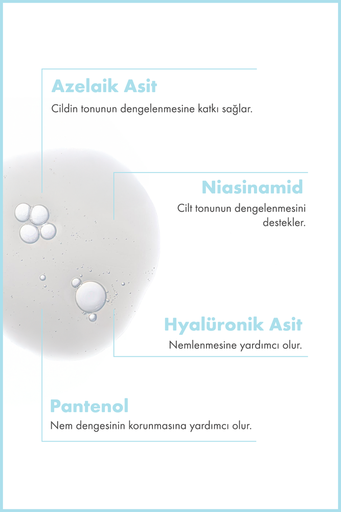 Cilt tonunun daha dengeli görünmesine, leke ve kızarıklık görünümünün azalmasına yardımcı olmak üzere geliştirilen bu formül, %10 Azelaik Asit içeriğiyle ciltteki renk düzensizliklerini hedefler. Niacinamide ve Panthenol ile zenginleştirilen yapısı, cilt bariyerinin desteklenmesine katkı sağlarken cildi yatıştırmaya ve dengelemeye yardımcı olur. Düzenli kullanımda cildin daha aydınlık, pürüzsüz ve sağlıklı bir görünüm kazanmasına destek olur.