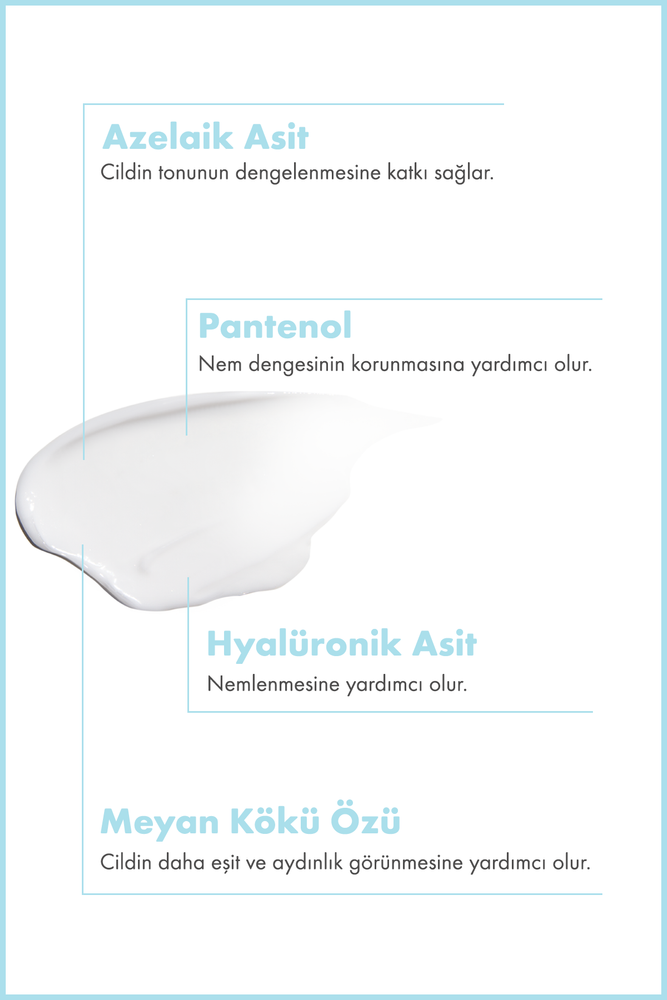 İçindekiler: Aqua (Water), Polyglycerin-6, Glycerin, Stearic Acid, Azelaic Acid, Squalane, Panthenol, Glycyrrhiza Glabra (Licorice) Root Extract, Sodium Hyaluronate, Allantoin, Sodium PCA, Glycine, Xanthan Gum, Propylene Glycol, Inulin Lauryl Carbamate, Potassium Cetyl Phosphate, Ethylhexylglycerin, Phenoxyethanol, Sodium Hydroxide, Tetrasodium EDTA.