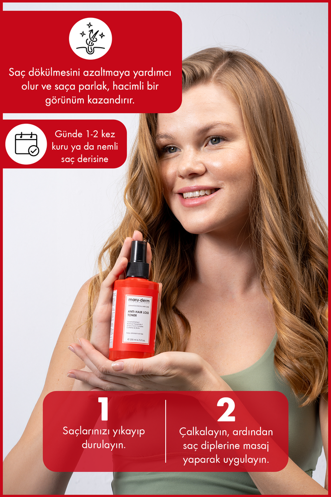 Maruderm Dökülme Karşıtı Saç Toniği, saç dökülmesinin azaltılmasına yardımcı olmak amacıyla özel olarak geliştirilmiştir. Hidrolize mısır, buğday ve soya proteinleri, atkuyruğu ekstraktı, aminoasit kompleksi, kafein ve biotin içeren zengin formülü; saç köklerinin desteklenmesine, saç tellerinin güçlenmesine ve saçın daha sağlıklı bir görünüme kavuşmasına katkı sağlar.