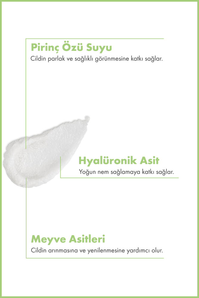 Öne Çıkan İçerikler: Pirinç Suyu, Hyalüronik Asit, Shea Yağı, Salatalık Özü