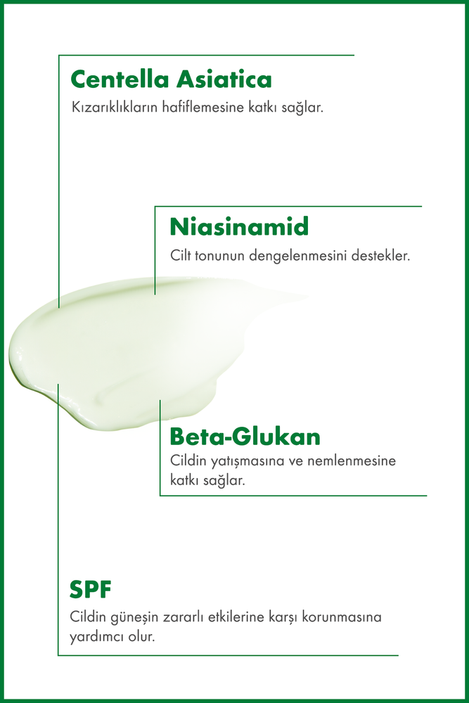 Centella Asiatica, Niacinamide ve Beta-Glucan içeren formülü sayesinde cildi yatıştırmaya, nem dengesini sağlamaya ve cilt bariyerini güçlendirmeye yardımcı olur. Renk eşitleyici etkisiyle cilt tonunu dengelemeyi hedefler. Hafif yapılı formülü ile ciltte ağırlık yapmadan gün boyu konforlu bir kullanım sunmayı destekler.
