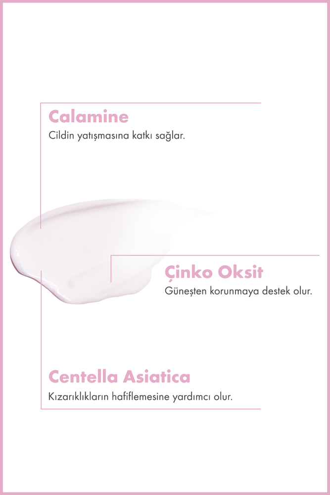 İçindekiler: Aqua (Water), Bis-Ethylhexyloxyphenol Methoxyphenyl Triazine, Zinc Oxide, C12-15 Alkyl Benzoate, Ethylhexyl Triazone, Glycerin, Centella Asiatica (Gotu Kola) Leaf Extract, Caprylic/Capric Triglyceride, Methylene Bis-Benzotriazolyl Tetramethylbutylphenol, Calamine, Stearic Acid, Sodium Hyaluronate, Allantoin, Panthenol, Potassium Cetyl Phosphate, Inulin Lauryl Carbomate, Decyl Glucoside, Sodium Benzoate,Sodium PCA, Sodium Lactate, Arginine, Aspartic Acid, PCA, Propylene Glycol, Glycine, Alanine, Serine, Valine, Proline, Threonine, Isoleucine, Histidine, Phenylalanine, Potassium Sorbate, Xanthan Gum, Sodium Hydroxide, Lactid Acid, Tetrasodium EDTA.