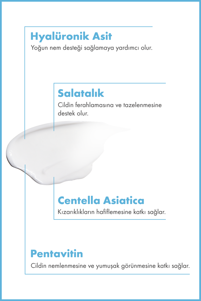 İçindekiler: Aqua, Glycerin, Sodium Hyaluronate, Propylene Glycol, Panthenol, Polyglyceryl-6 Stearate, Cetearyl Alcohol, Glyceryl Stearate, Centella Asiatica (Gotu Kola) Leaf Extract, Maltodextrin, Saccharide Isomerate, Cucumis Sativus Fruit Extract, Lactobacillus Lysate, Madecassoside, Sodium PCA, Sodium Lactate, Ammonium Acryloyldımethyltaurate/Beheneth-25 Methacrylate Crosspolymer, Arginine, Aspartic Acid, Beta - Glucan, Trilaureth-4 Phosphate, Caprylic/Capric Triglyceride, Polyglyceryl-6 Behenate, Microcrystalline Cellulose, Tocopheryl Acetate, PCA, Glycine, Alanine, Serine, Valine, Proline, Threonine, Isoleucine, Histidine, Cellulose Gum, Phenylalanine, Sodium Citrate, Citric Acid, Xanthan Gum, Sodium Benzoate, Potassium Sorbate.