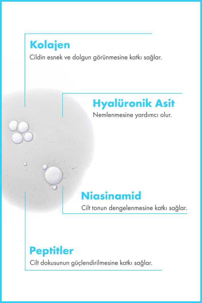 Cilde yoğun nem kazandırmak, elastikiyetini artırmak ve daha dolgun bir görünüm elde etmek için geliştirilen formül; Hyalüronik Asit ve Kolajen ile zenginleştirilmiştir. Hyalüronik Asit, cildin nem seviyesini destekleyerek kuruluk ve gerginlik hissini azaltırken, Kolajen cilt esnekliğini artırarak daha pürüzsüz ve canlı bir görünüm kazandırır. Düzenli kullanımda cilt daha nemli, dolgun ve sağlıklı bir görünüme kavuşur.