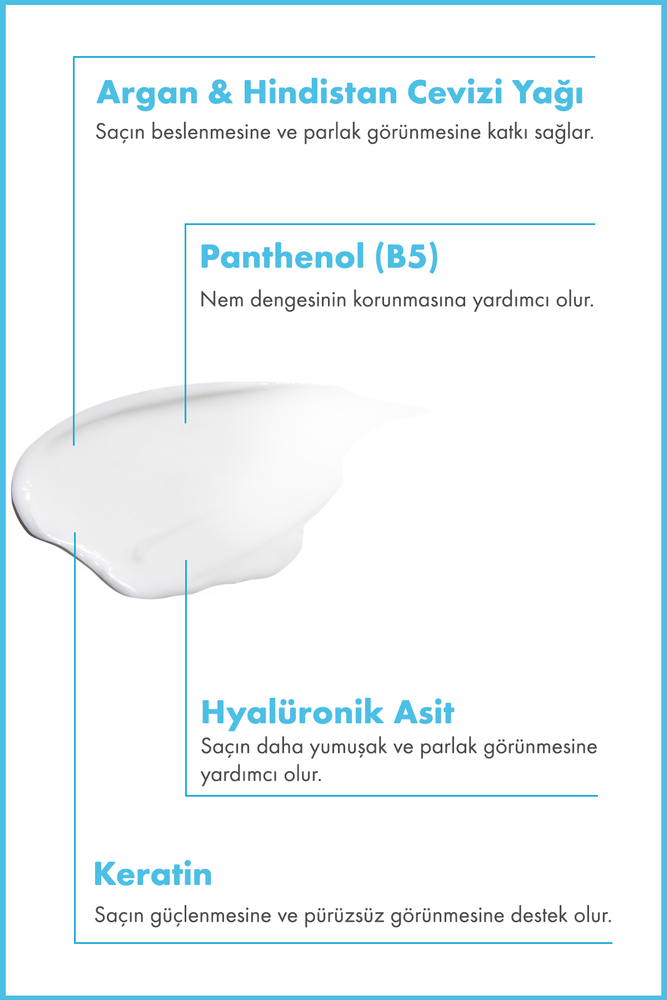 Öne Çıkan İçerikler: Hyalüronik Asit, Panthenol, Keratin, Argan Yağı, Hindistan Cevizi Yağı.