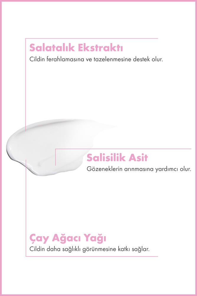 Cildi derinlemesine temizlemeye, gözenek görünümünün azalmasına ve fazla sebumun dengelenmesine yardımcı olmak üzere geliştirilmiştir. Salisilik asit, cilt yüzeyinde biriken ölü hücre ve kirleri nazikçe arındırarak daha pürüzsüz bir görünüm elde edilmesini destekler. Çay ağacı yağı, yağ dengesinin korunmasına ve cilt kusurlarının oluşumunun azaltılmasına katkı sağlarken; salatalık ekstraktı cildi yatıştırarak ferah ve canlı bir his kazandırır. Düzenli kullanımda cildin daha temiz, dengeli ve taze görünmesine yardımcı olur.