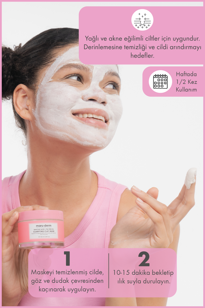 Kullanım Şekli/Uyarılar: Temizledikten sonra, göz ve dudak çevresinden kaçınarak temiz ve kuru cilde eşit bir tabaka halinde uygulayın. 10–15 dakika bekletin, ardından ılık suyla iyice durulayın. Haftada 1–3 kez, tercihen akşam kullanın. Yalnızca haricen kullanılır. Göz ile doğrudan temastan kaçınınız; temas halinde bol suyla durulayınız. Hasarlı veya tahriş olmuş cilde uygulamayınız. İlk kullanım öncesi yama testi yapınız. Tahriş oluşursa kullanımı bırakınız ve dermatoloğa danışınız. Çocukların ulaşamayacağı yerde saklayınız. 3 yaş altı çocuklar için ürünlerde kullanılmamalıdır. Ürünü +5 °C ile +25 °C arasındaki oda sıcaklığında saklayınız.
