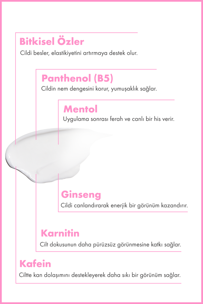 Mentol ve kafein ile zenginleştirilen formülü, cilde ferahlatıcı bir etki kazandırırken dolaşımın desteklenmesine yardımcı olur. Panthenol ve bitki özleriyle güçlendirilen içeriği, cilt bariyerinin onarılmasına katkı sağlarken cildin doğal savunma mekanizmalarını desteklemeyi hedefler. Cildin daha sıkı, esnek ve dengeli bir görünüm kazanmasına yardımcı olurken, nazik ancak etkili yapısı sayesinde cildi yumuşatır ve pürüzsüz bir his bırakır. Düzenli kullanımda cilt dokusunun yenilenmesine ve daha aydınlık, sağlıklı bir görünüm elde edilmesine destek olur.