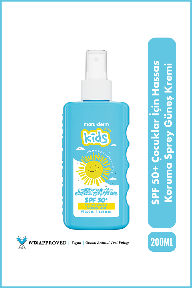 Maruderm SPF 50+ Çocuklar İçin Hassas Koruma Sprey Güneş Kremi, SPF 50+ geniş spektrum korumasıyla UVA ve UVB ışınlarına karşı etkili bir koruma sunar. Panthenol içeriği cildi nemlendirmeye ve yatıştırmaya yardımcı olurken, E vitamini antioksidan desteği sağlar. Hafif ve hızlı emilen yapısı ciltte yağlı veya yapışkan bir his bırakmaz; sprey formu sayesinde kolay, pratik ve eşit uygulama imkânı sunar.