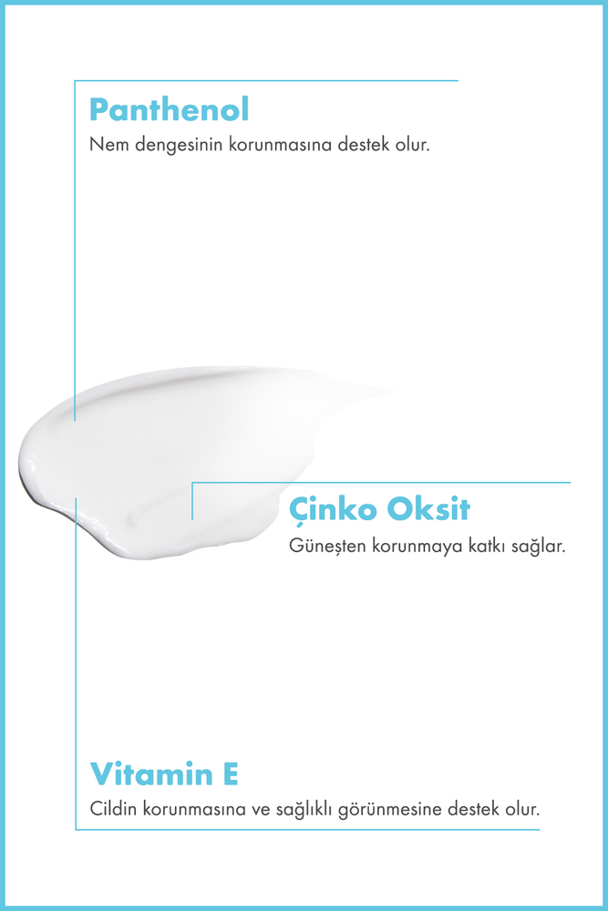İçindekiler: Aqua (Water), Zinc Oxide, Glycerin, C12-15 Alkyl Benzoate, Caprylic/Capric Triglyceride, Ethylhexyl Triazone, Stearic Acid, Bis-Ethylhexyloxyphenol Methoxyphenyl Triazine, Diethylamino Hydroxybenzoyl Hexyl Benzoate, Tocopheryl Acetate, Panthenol, Potassium Cetyl Phosphate, Inulin Lauryl Carbamate, Xanthan Gum, Potassium Sorbate, Lactic Acid, Sodium Benzoate.