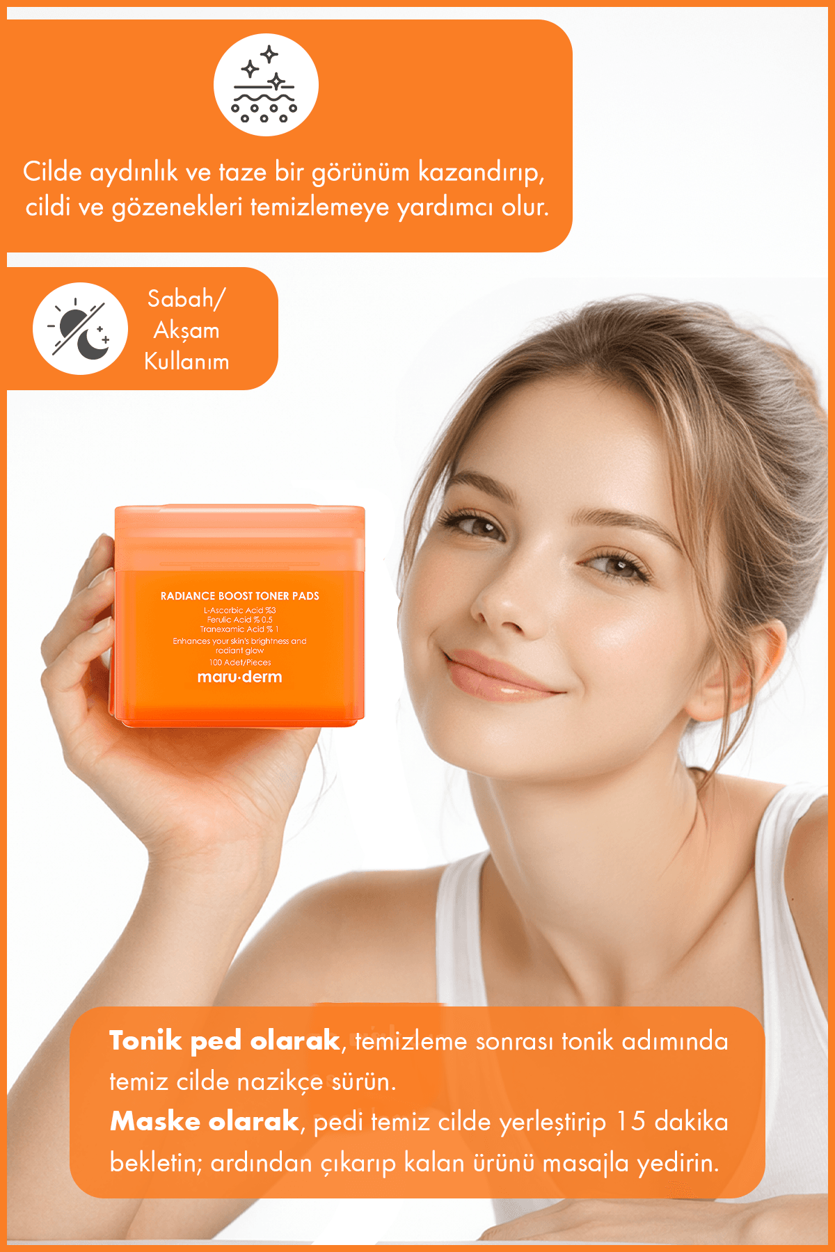 Maruderm %3 L-Ascorbic Acid, %1 Tranexamic Acid ve %0.5 Ferulic Acid içeren Aydınlatıcı Hidrojel Tonik Ped, cilt tonunun daha aydınlık görünmesine yardımcı olmak ve cilt bakım rutinini desteklemek için geliştirilmiş pratik bakım pedleridir.