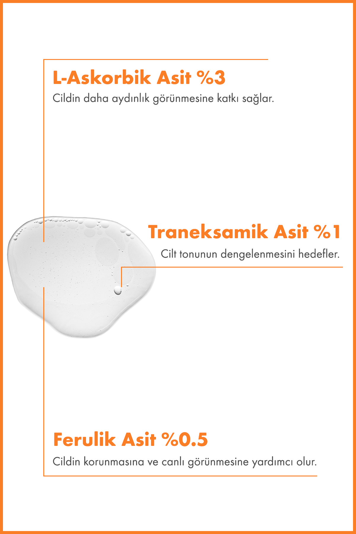 Formülünde bulunan %3 L-Ascorbic Acid (C Vitamini), cildin daha canlı ve aydınlık görünmesine yardımcı olur. %1 Tranexamic Acid, cilt tonu eşitsizliği görünümünün dengelenmesine katkıda bulunur.