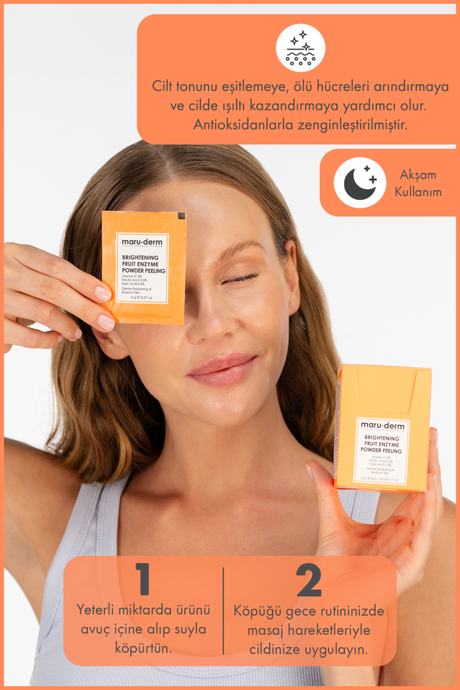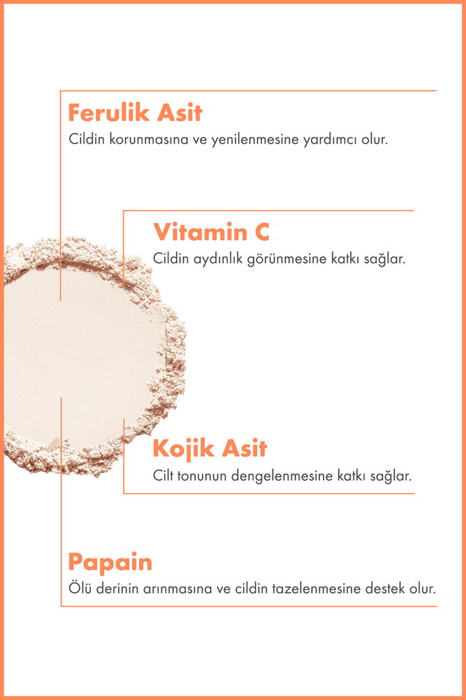 C Vitamini, Ferulik Asit ve Kojik Asit içeren bu toz temizleyici; matlık, ton eşitsizliği ve lekelenme görünümü yaşayan ciltler için geliştirilmiştir. Su ile temas ettiğinde yumuşak köpüğe dönüşen formu sayesinde cilt yüzeyinin nazikçe arındırılmasına yardımcı olur. Düzenli kullanımda daha pürüzsüz, daha ışıltılı ve daha canlı bir cilt görünümünün desteklenmesine katkı sağlar.