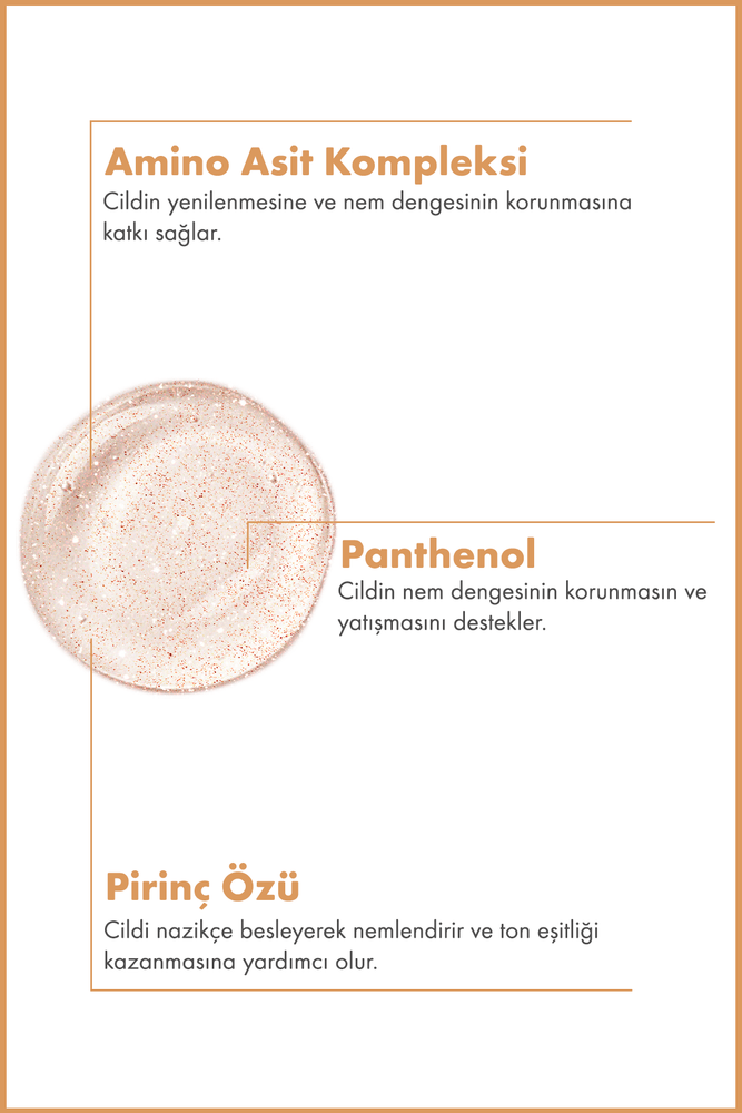 Formülünde bulunan Pirinç Kepeği Suyu ve Pirinç Ekstraktı (Oryza Sativa), cilt görünümünün daha canlı ve aydınlık olmasına katkıda bulunur.