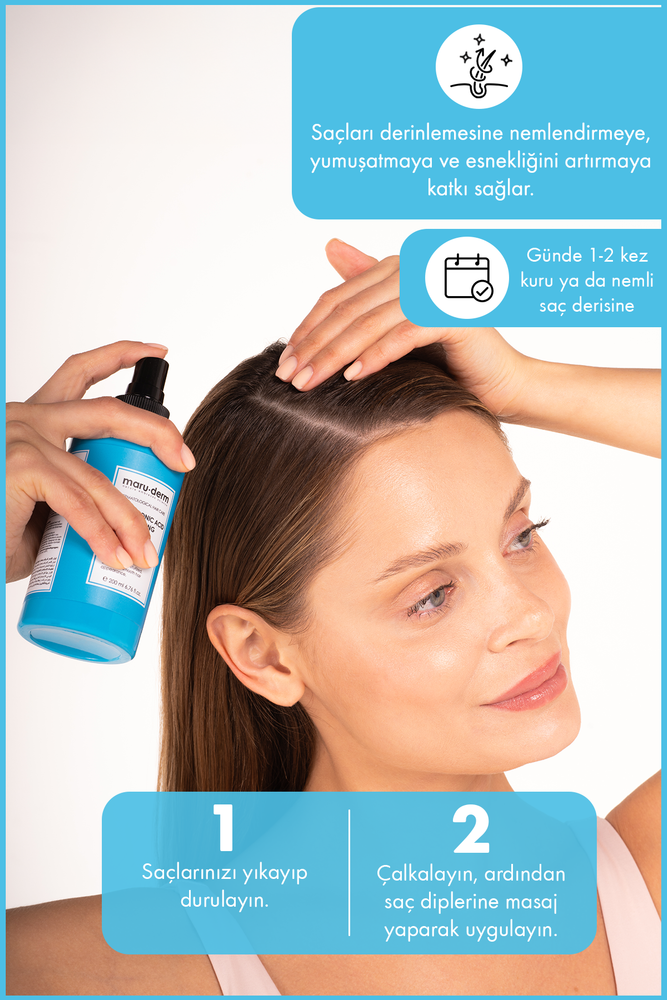 Hyaluronik Asit, Keratin ve Aloe Vera içeren bu saç toniği; saçın nem dengesinin korunmasına yardımcı olurken daha yumuşak ve pürüzsüz bir görünümün desteklenmesine katkı sağlar. Günlük kullanıma uygundur ve durulama gerektirmez.