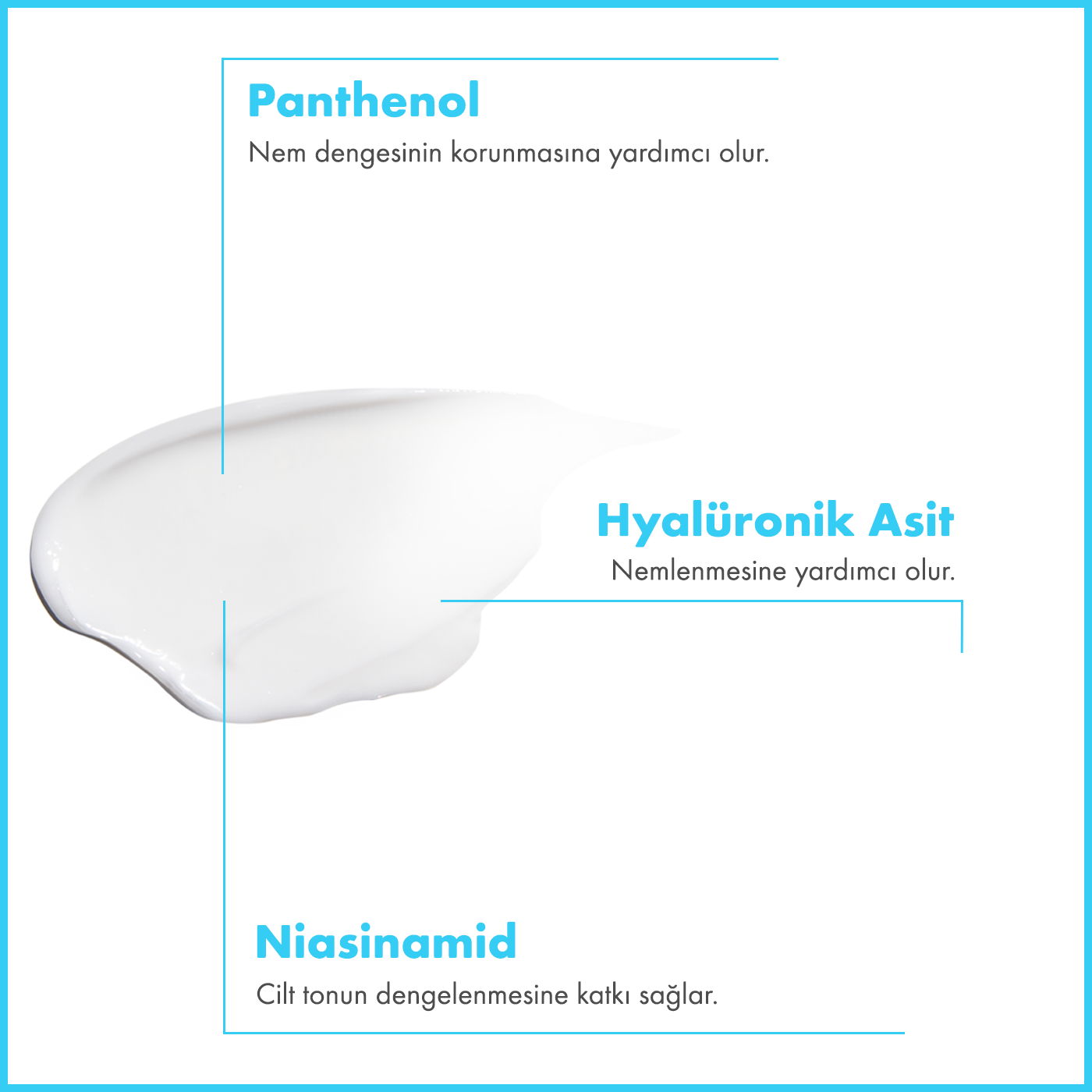Formülünde bulunan Hyalüronik Asit (Sodium Hyaluronate), cildin yoğun şekilde nemlenmesine yardımcı olur ve cildin daha dolgun görünmesine katkıda bulunur. Niacinamide, cilt görünümünün dengelenmesine yardımcı olur ve cilt bakım rutinini destekler. Panthenol ve Allantoin, cildin yatışmasına yardımcı olur ve cilt bariyerinin desteklenmesine katkıda bulunur.