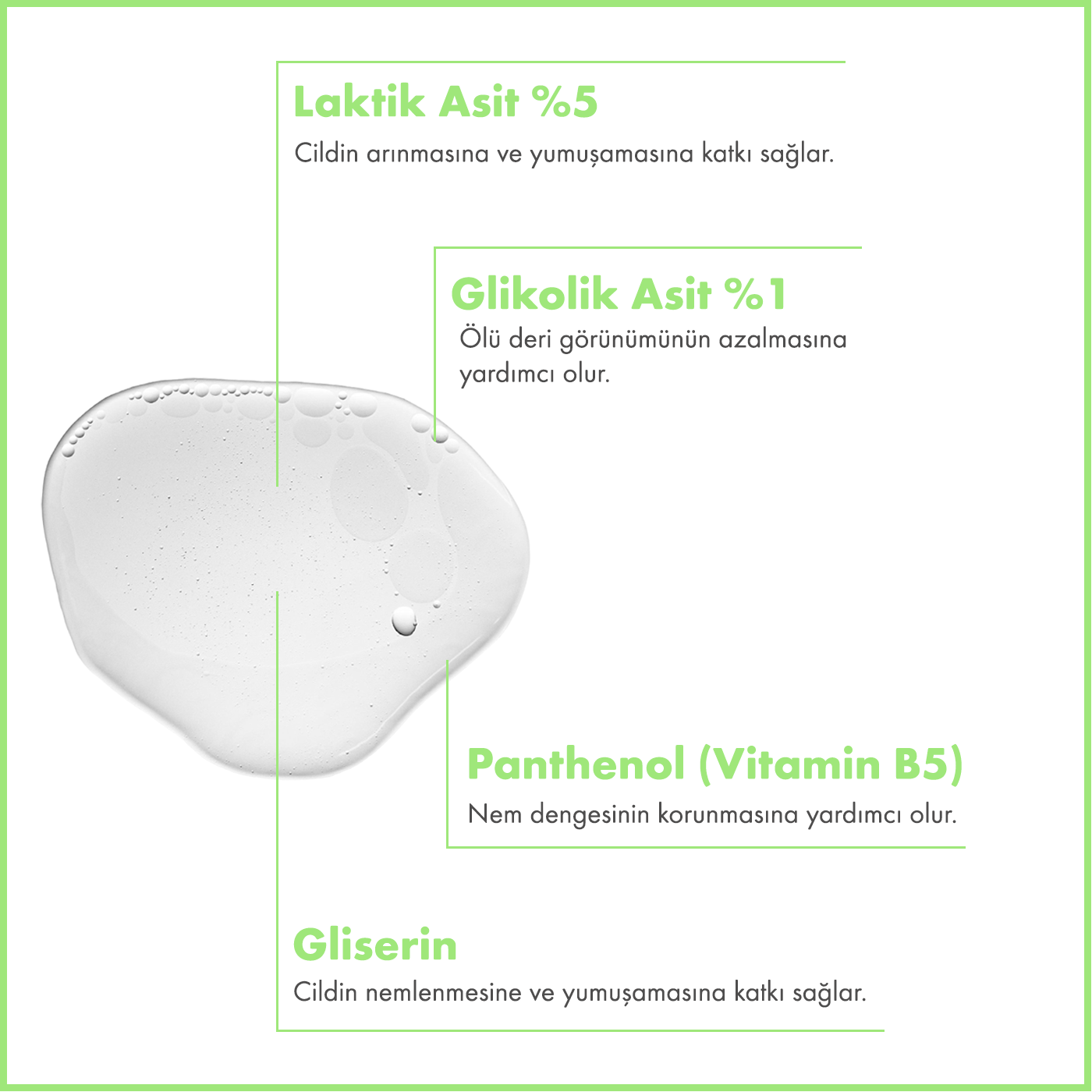 Formülünde bulunan %5 Laktik Asit, cilt yüzeyinin nazik şekilde arındırılmasına yardımcı olur ve cildin daha pürüzsüz görünmesine katkıda bulunur. %1 Glikolik Asit, cilt yüzeyinin yenilenmesine destek sağlar ve cilt görünümünün daha aydınlık olmasına yardımcı olur.