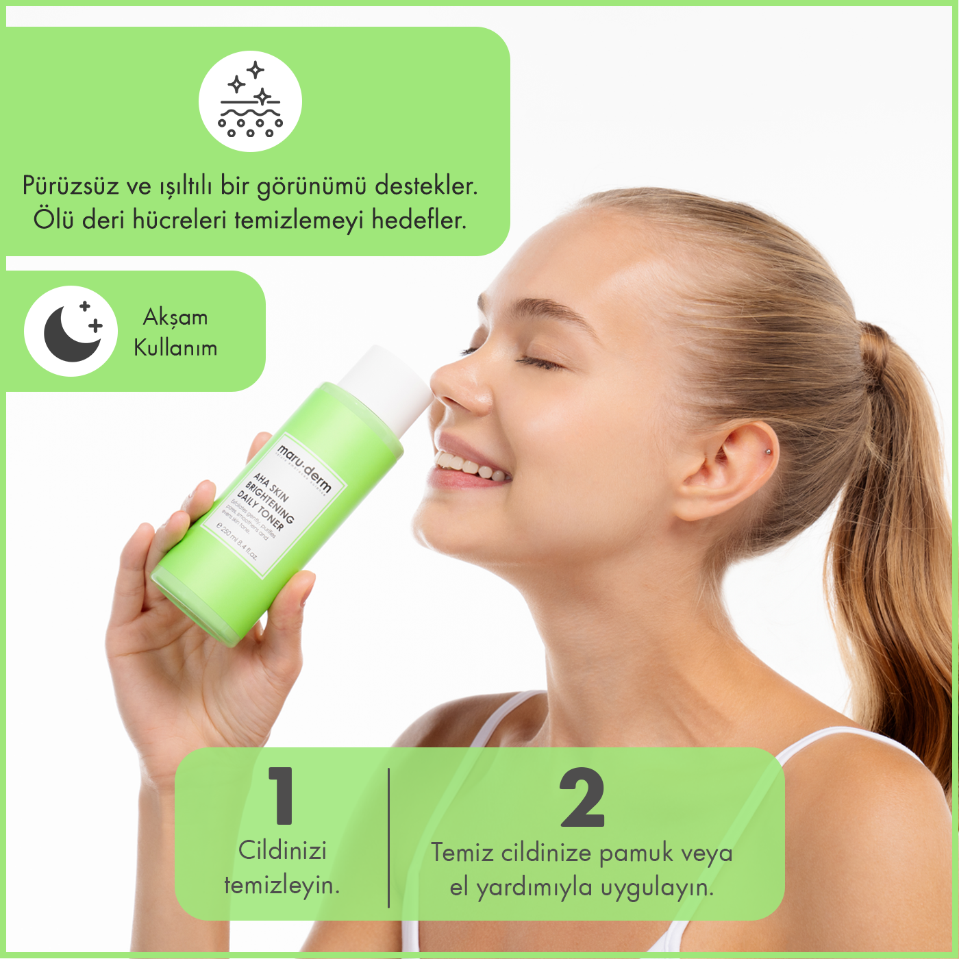 AHA içeren tonikler cilt yüzeyindeki ölü hücrelerin arındırılmasına yardımcı olur ve cildin daha pürüzsüz görünmesini destekler.
