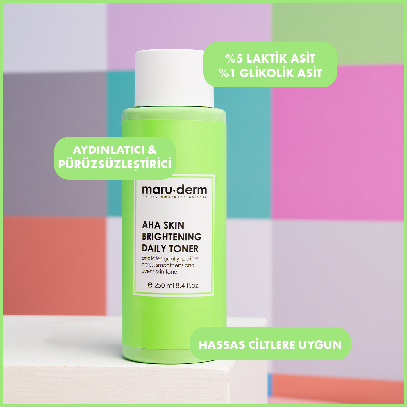 Maruderm %5 Laktik Asit ve %1 Glikolik Asit içeren AHA Tonik, cilt yüzeyinin nazik şekilde yenilenmesine yardımcı olmak ve cilt tonu eşitsizliği görünümünü azaltmaya destek sağlamak için geliştirilmiş bakım toniğidir.