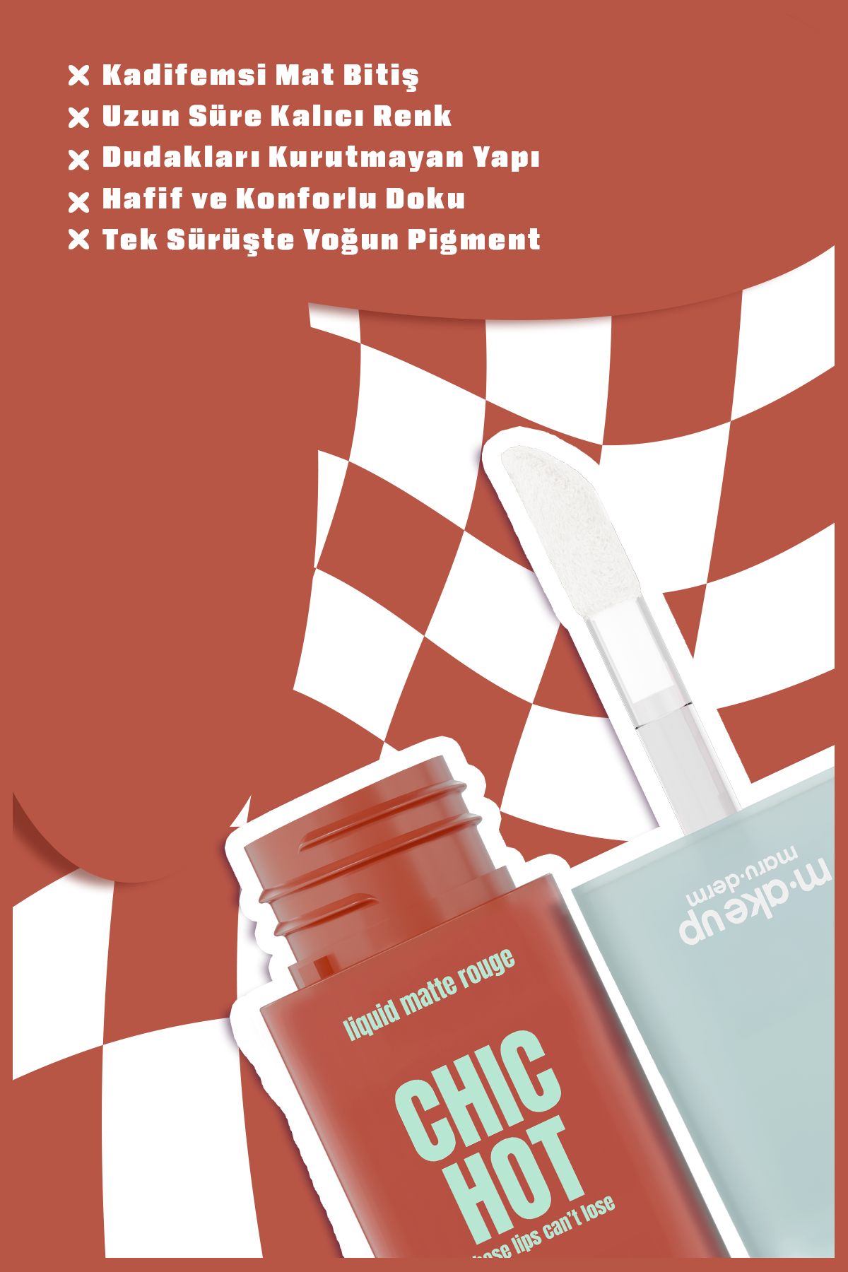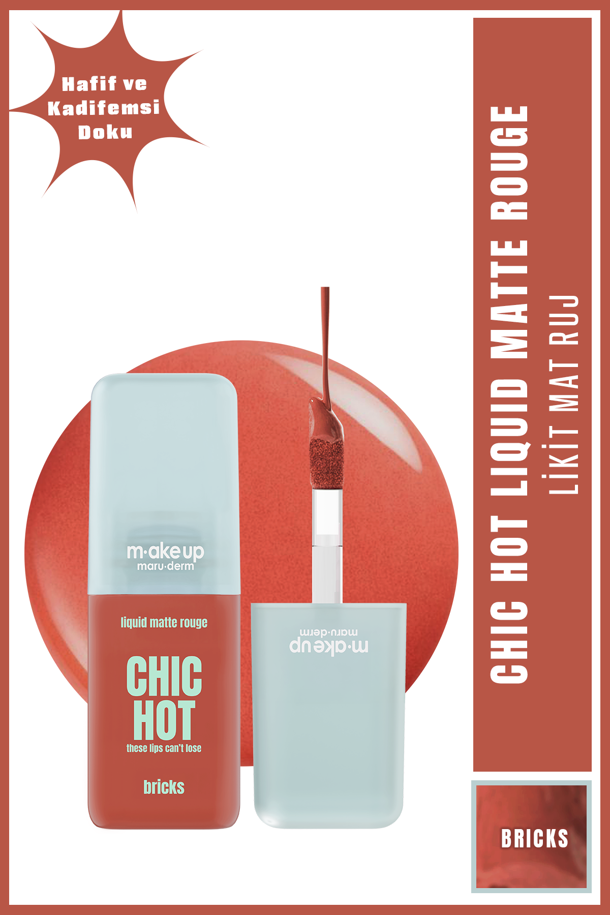 Kadifemsi mat bitişli, uzun süre kalıcı likit ruj. Bricks tonu ile dudaklara yoğun tuğla kırmızısı renk kazandırmaya yardımcı olur. Tek katta yüksek pigment sunar. Hafif ve konforlu formüle sahiptir. Günlük ve iddialı makyajlara uygundur.