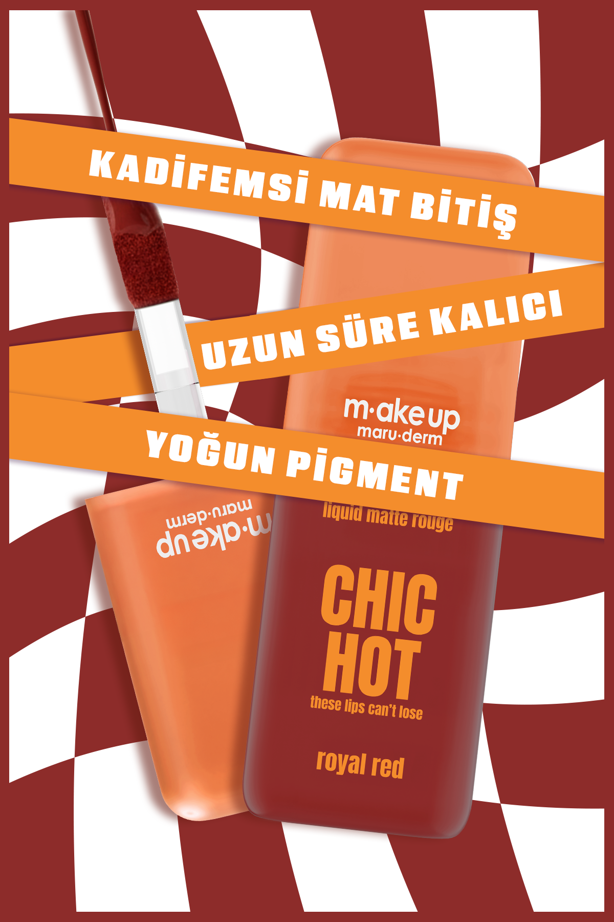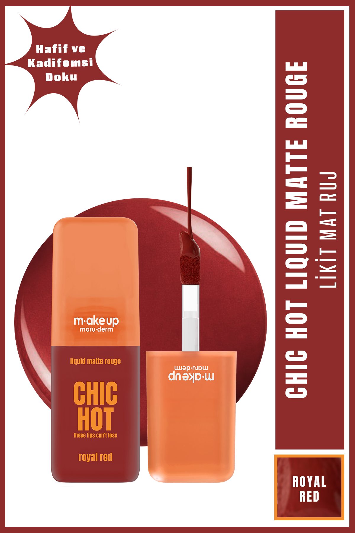 Kadifemsi mat bitişli, uzun süre kalıcı likit ruj. Royal Red tonu ile dudaklara güçlü ve zamansız kırmızı renk kazandırmaya yardımcı olur. Tek katta yüksek pigment sunar. Hafif ve konforlu formüle sahiptir. Günlük ve özel makyajlara uygundur.