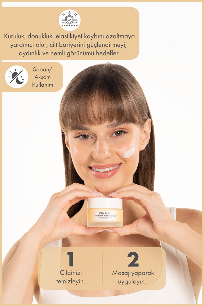 Maruderm Pirinç Özlü Aydınlatıcı ve Nemlendirici Krem, cildin daha aydınlık görünmesine yardımcı olmak ve cilt nem dengesini desteklemek için geliştirilmiş pirinç özü ve hyalüronik asit içeren bakım kremidir.