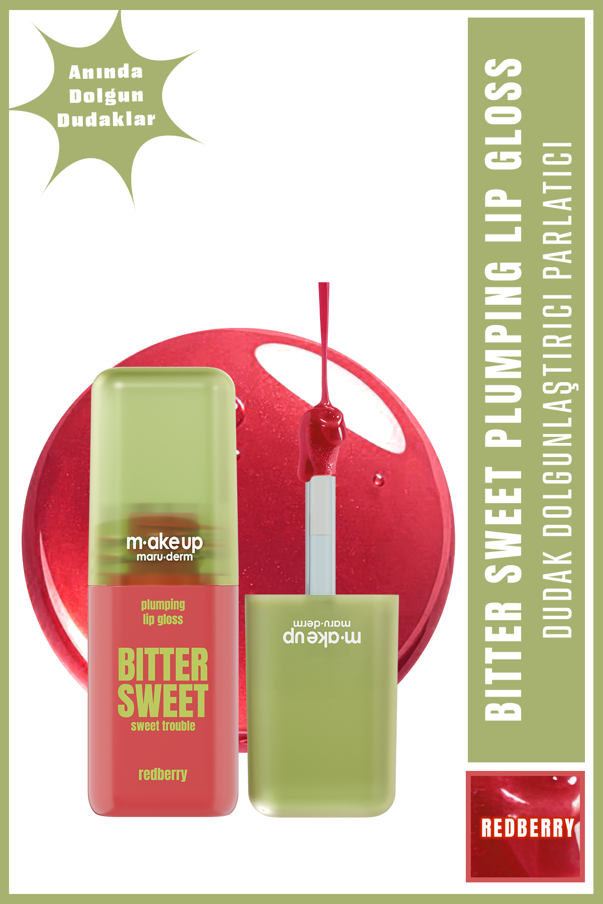Redberry, hem tek başına çarpıcı bir dudak görünümü hem de ruj üzerine ekstra hacim ve parlaklık için ideal bir seçenektir.