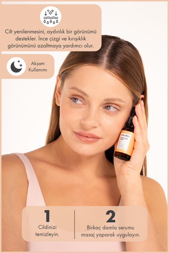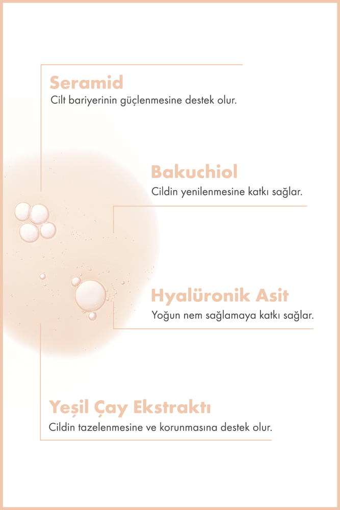 Retinol %0.3, Bakuchiol, Yeşil Çay Ekstraktı ve Hyaluronik Asit içeren bu gece serumu; ince çizgi görünümü, matlık ve pürüzlü doku yaşayan ciltler için geliştirilmiştir. Düşük oranlı retinol içeriği sayesinde retinol kullanımına yeni başlayanlar için uygun bir başlangıç seviyesi sunar. Cildin daha dengeli ve daha canlı görünmesine katkı sağlar.