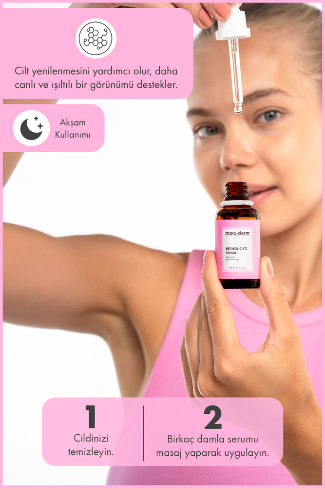 Cildin yenilenme sürecini desteklemek, ince çizgi ve kırışıklık görünümünü azaltmaya yardımcı olmak ve daha pürüzsüz bir cilt dokusu kazandırmak amacıyla formüle edilmiştir; %0.5 oranındaki Retinol içeriği cilt hücrelerinin yenilenmesini teşvik ederken cilt tonu eşitsizliklerinin ve mat görünümün azalmasına destek olur, düzenli kullanımda cildin daha canlı, sıkı ve genç bir görünüm kazanmasına yardımcı olur, ciltte ağırlık hissi bırakmaz ve gece bakım rutinine rahatlıkla entegre edilebilir, tüm cilt tipleri için uygundur, özellikle yaşlanma belirtilerine ve cilt dokusu düzensizliklerine yönelik etkili bir bakım sunar.