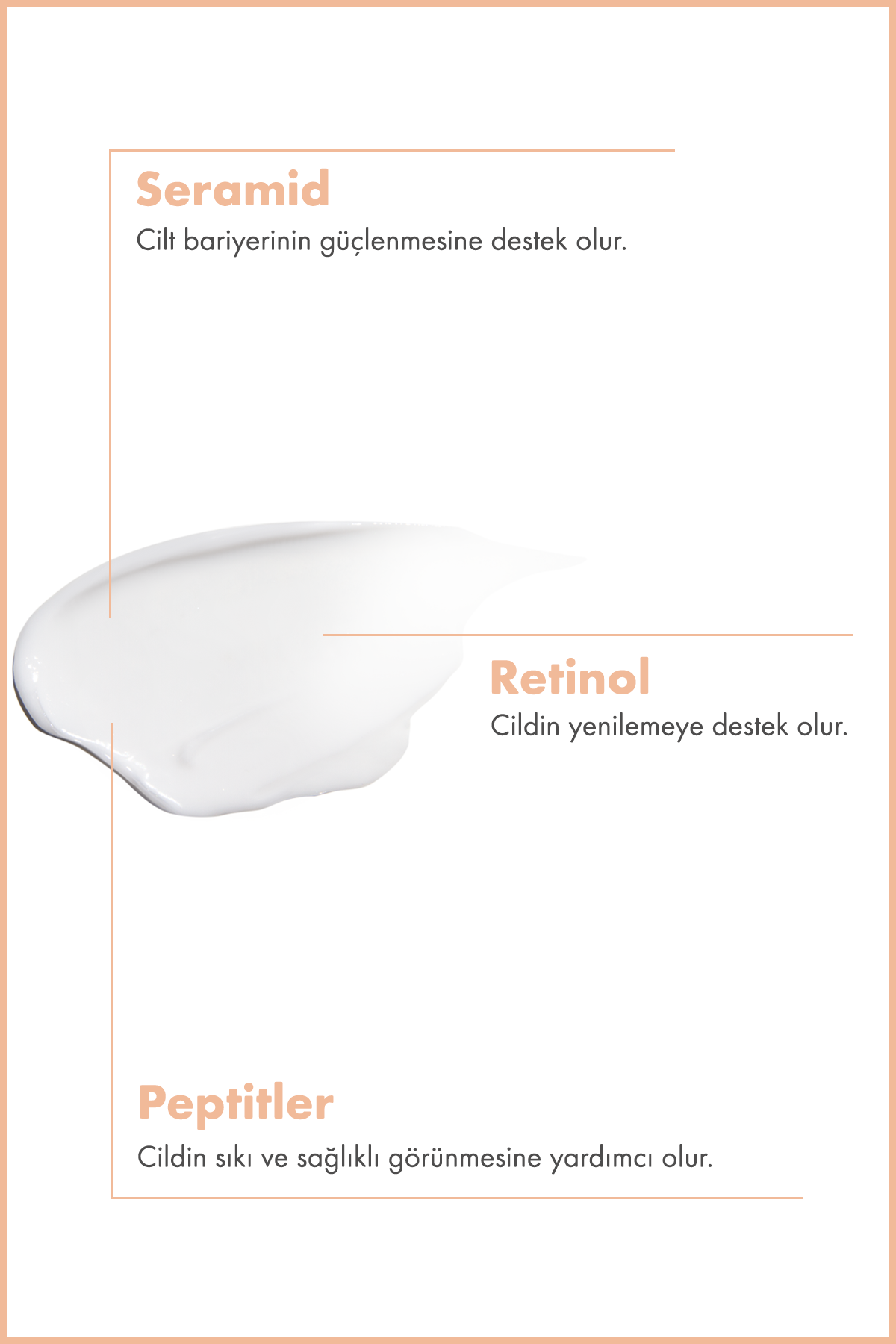 Formülünde bulunan %0.3 Retinol, cilt görünümünün yenilenmesine yardımcı olur ve ince çizgi görünümünün azalmasına katkıda bulunur.