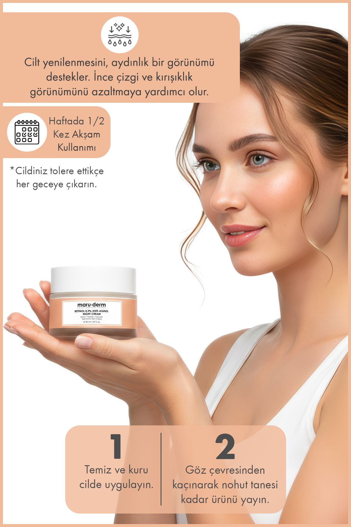 Maruderm %0.3 Retinol Yaşlanma Karşıtı Gece Kremi, cilt görünümünün yenilenmesine yardımcı olmak ve ince çizgi görünümünü azaltmaya destek olmak için geliştirilmiş retinol ve peptid içeren gece bakım kremidir.
