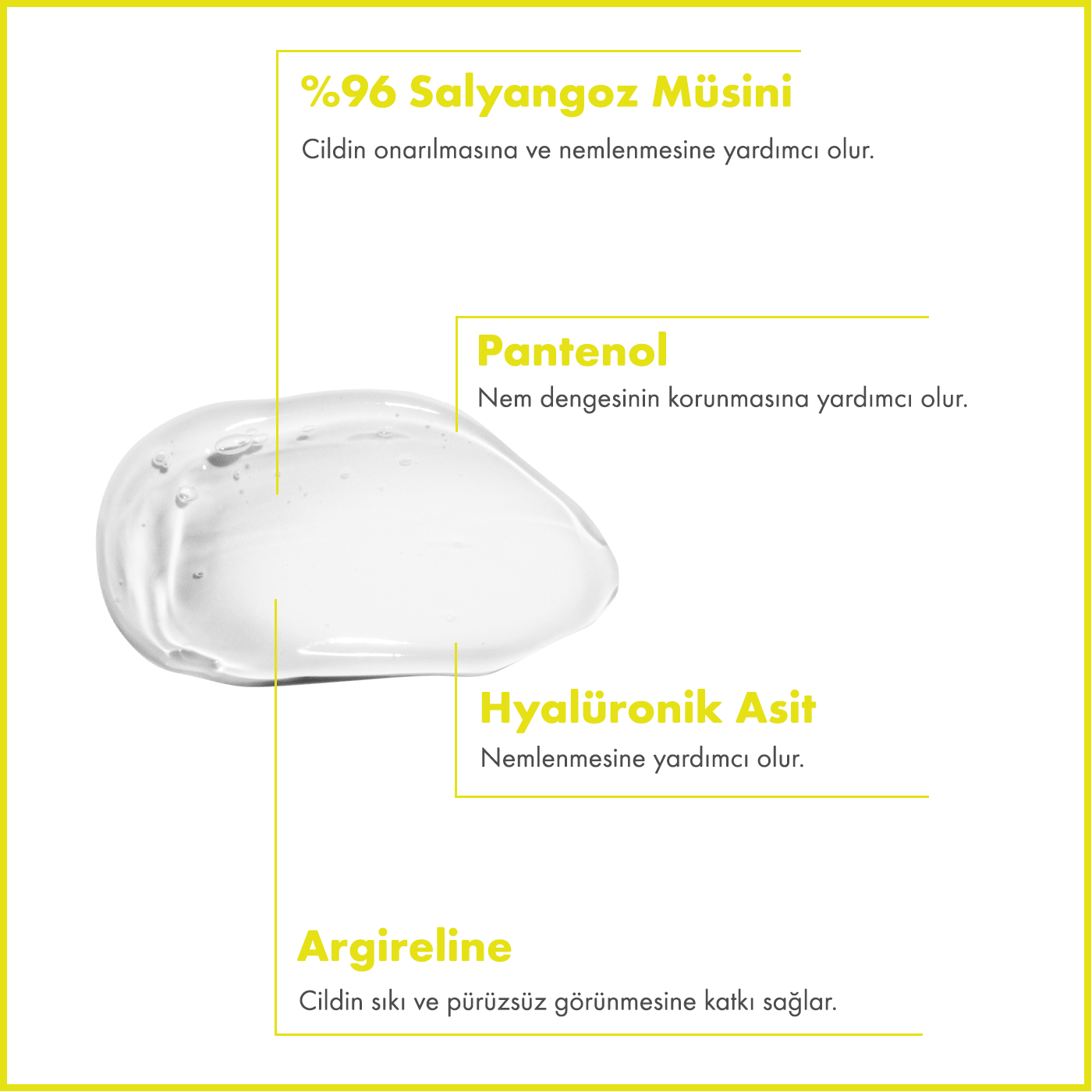 Hyaluronik Asit ve Panthenol, cildin nem seviyesini desteklerken cildin daha dolgun ve sağlıklı görünmesine yardımcı olur. Allantoin ve Betaine ise cildi yatıştırmaya yardımcı olur ve cildin daha konforlu hissetmesini destekler.