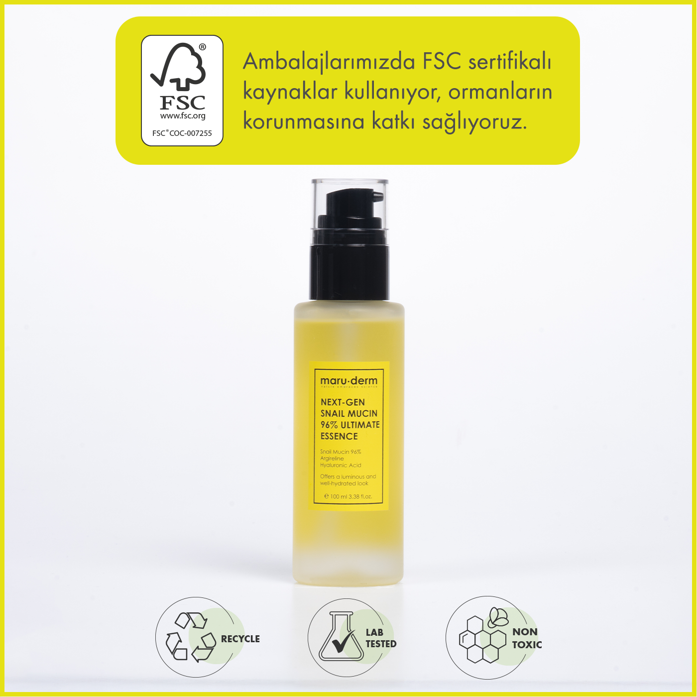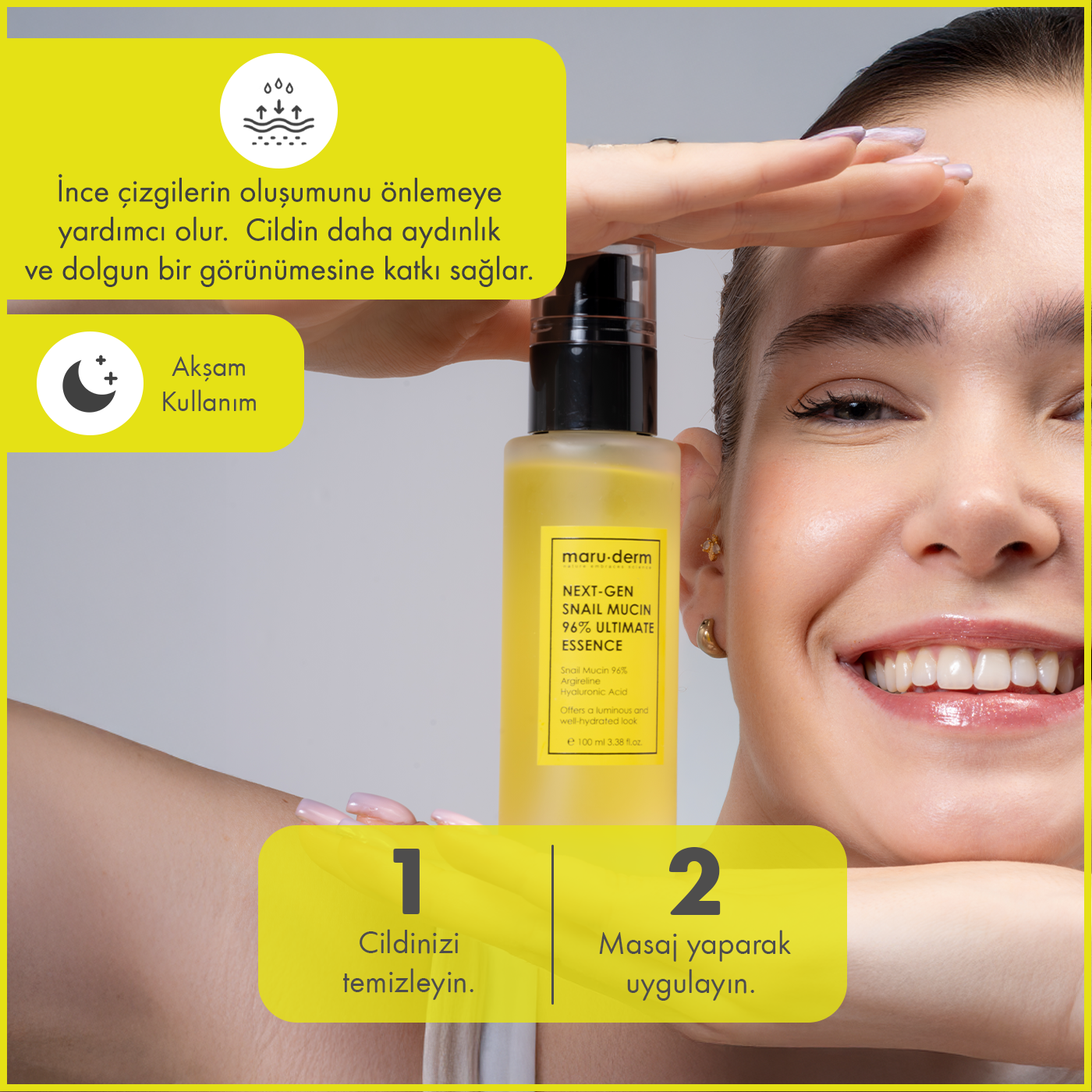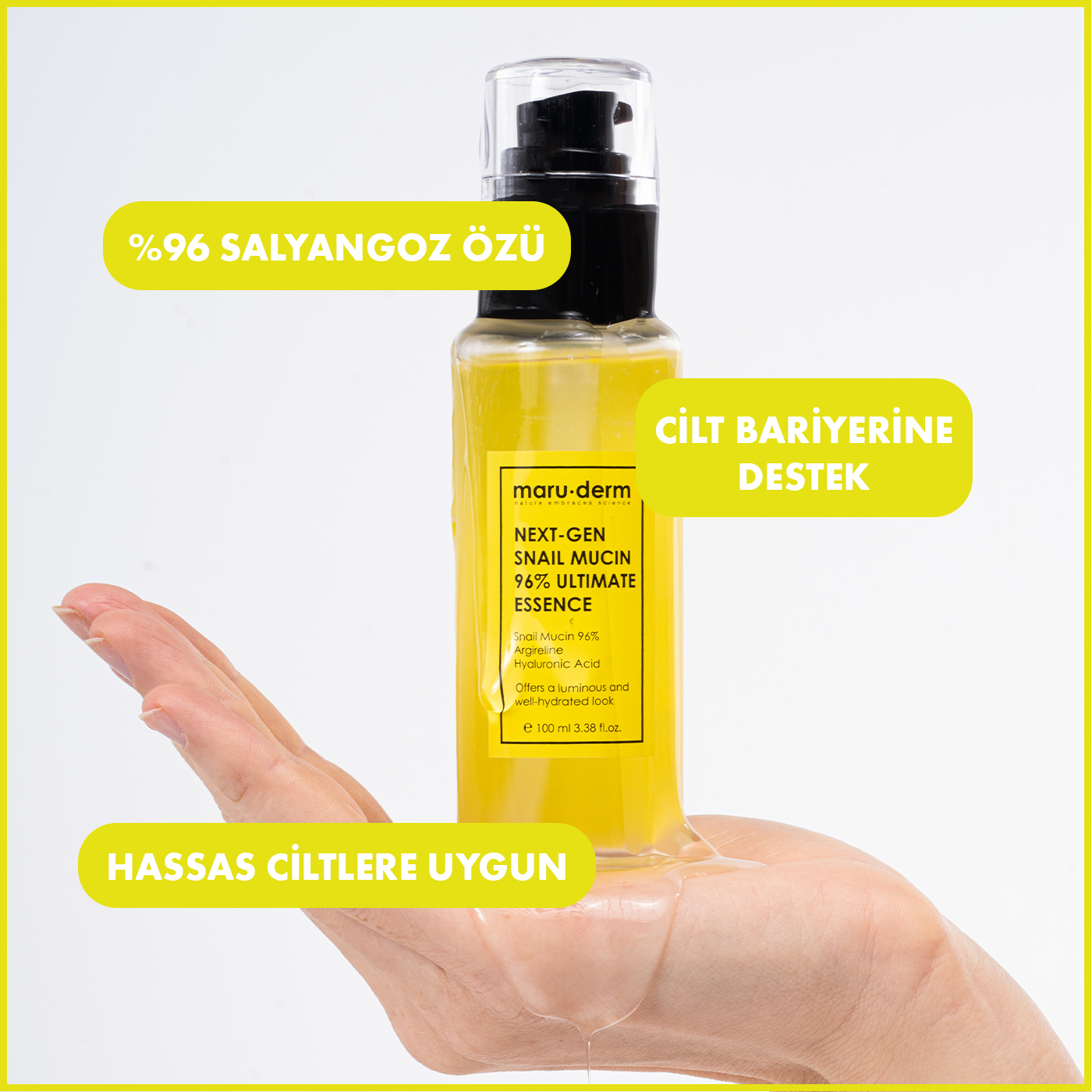 Maruderm %96 Salyangoz Özlü Onarıcı Essence Tonik, cildin nem dengesini desteklemeye ve cilt bakım rutinine yoğun nem kazandırmaya yardımcı olmak için geliştirilmiş essence formunda bakım toniğidir.