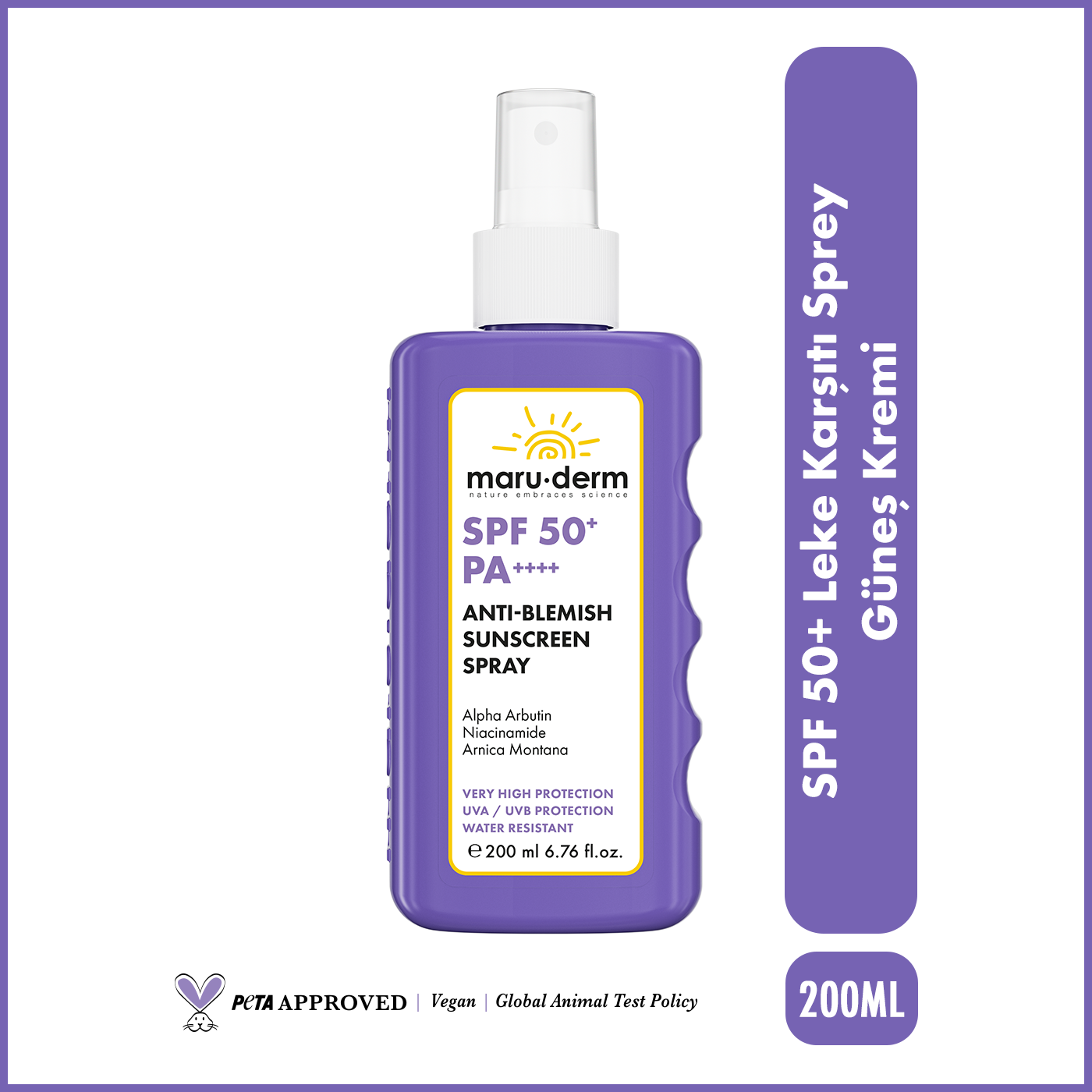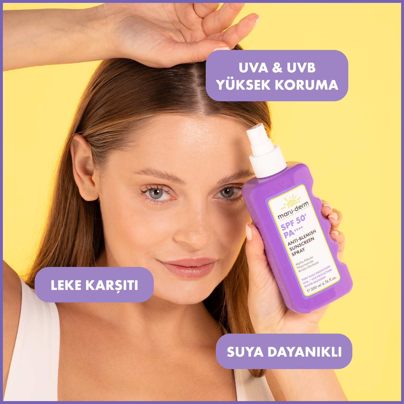 Maruderm SPF 50+ PA++++ Leke Karşıtı Güneş Spreyi, cildi güneş ışınlarının zararlı etkilerine karşı korumaya yardımcı olmak ve cilt tonu eşitsizliği görünümünü azaltmaya destek olmak için geliştirilmiş geniş spektrumlu güneş koruyucu spreydir.