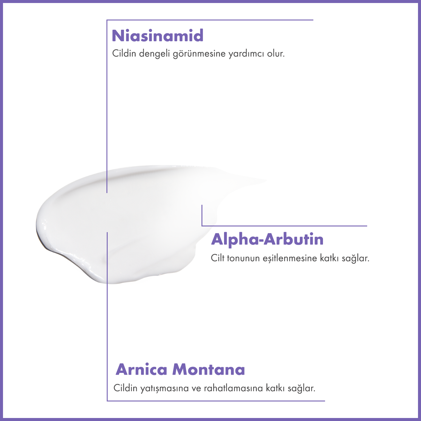 Alpha-Arbutin ve Niacinamide, cilt tonu eşitsizliği görünümünün dengelenmesine yardımcı olur ve cildin daha aydınlık görünmesine katkıda bulunur.