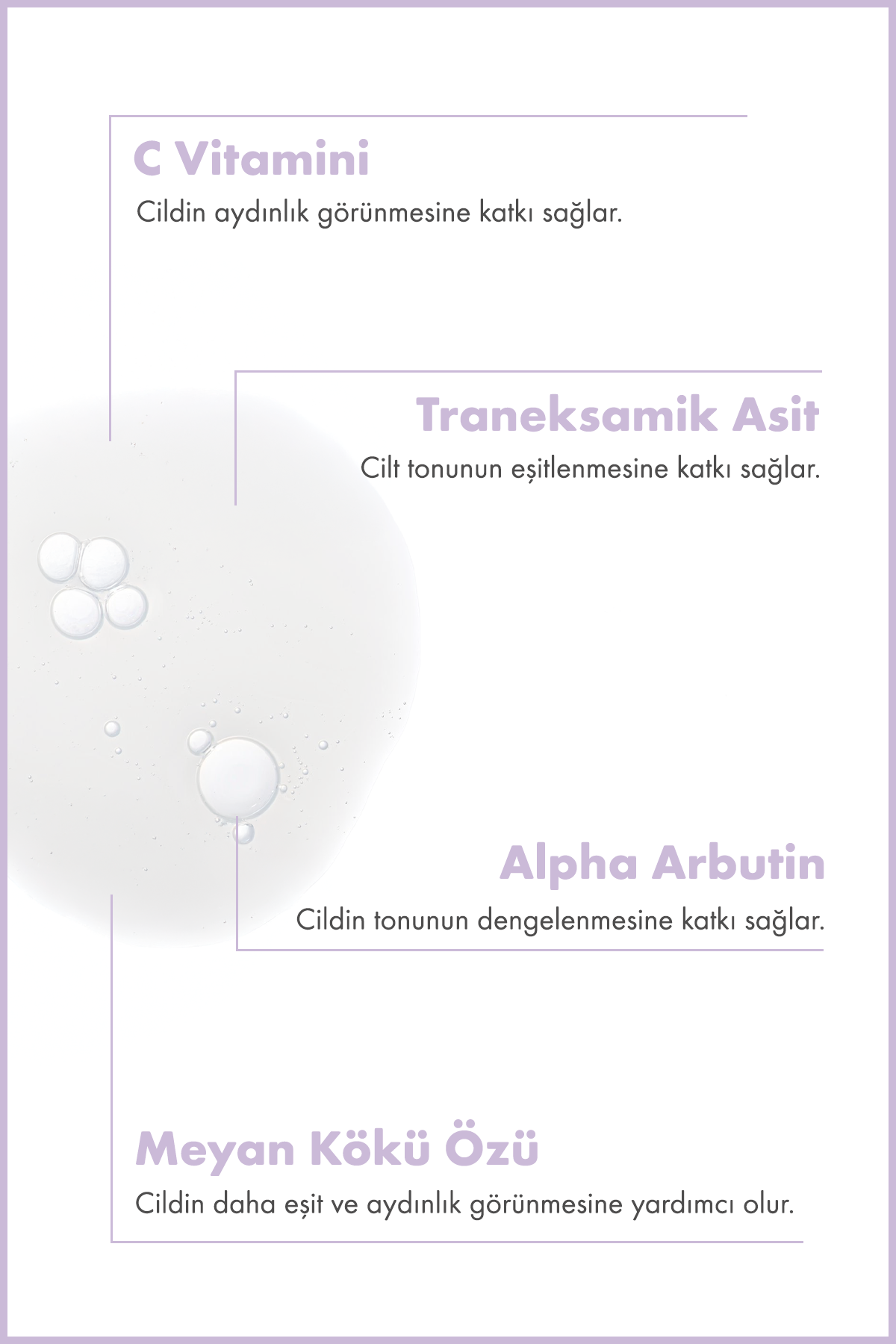 Tranexamic acid içeren serumlar cilt tonu eşitsizliği görünümünün dengelenmesine yardımcı olur ve cilt bakım rutinini destekler.