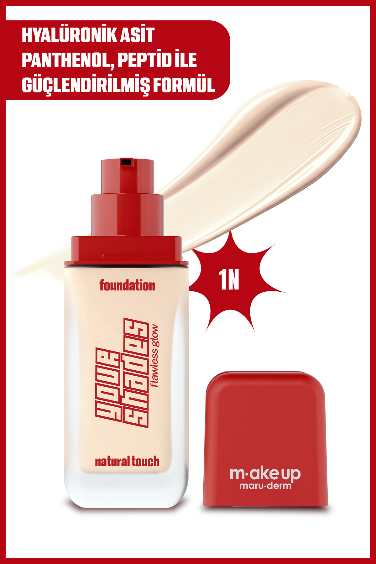 Yarı mat bitişli, uzun süre kalıcı fondöten. Cilt tonunu eşitlemeye ve kusur görünümünü azaltmaya yardımcı olur. Orta–yüksek kapatıcılık sunar. Kat kat kullanım yaparak kapatıcılığı arttırabilirsiniz. Hyaluronik asit ve panthenol ile nem desteği sağlar. 1N tonu açık ve nötr alt tonlu ciltler için uygundur.