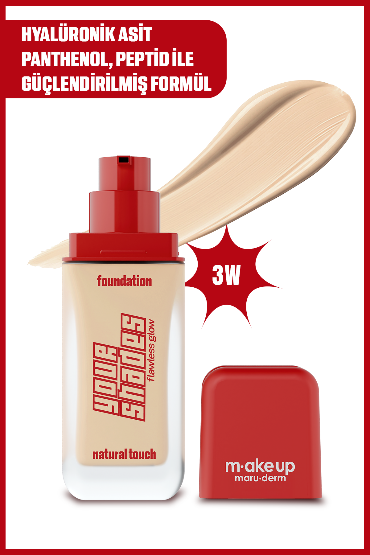 Yarı mat bitişli, uzun süre kalıcı fondöten. Cilt tonunu eşitlemeye ve kusur görünümünü azaltmaya yardımcı olur. Orta–yüksek kapatıcılık sunar. Kat kat kullanım yaparak kapatıcılığı arttırabilirsiniz.Hyaluronik asit ve panthenol ile nem desteği sağlar. 3W tonu orta–buğday ve sıcak alt tonlu ciltler için uygundur.