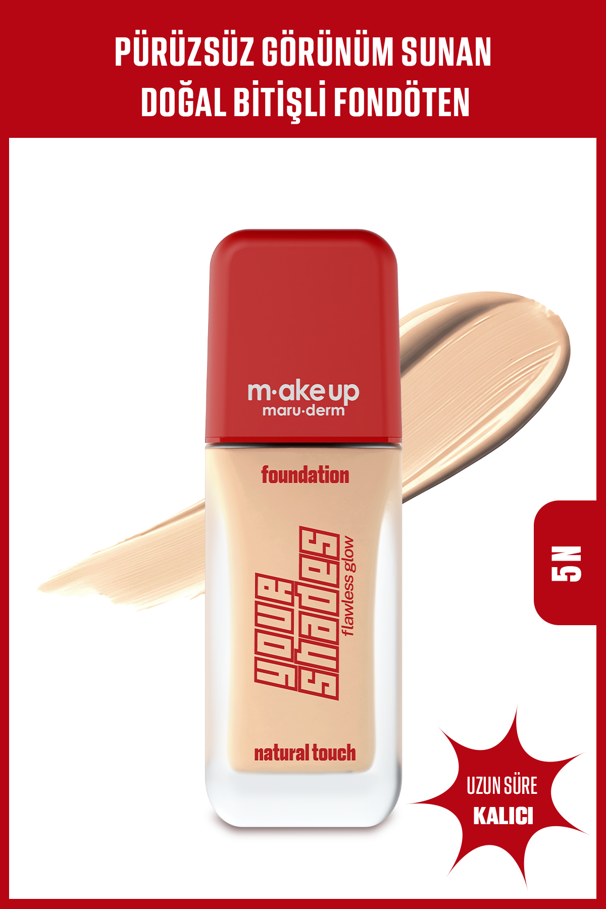Yarı Mat Bitişli Uzun Süre Kalıcı Fondöten 5N, cilt tonu eşitsizliklerini dengelemeye ve kusur görünümünü azaltmaya yardımcı olurken doğal ve dengeli bir yarı mat bitiş sunar. Akışkan ve ciltle uyum sağlayan yapısı sayesinde kolay uygulanır, homojen dağılım sağlar ve gün boyu konforlu bir görünüm destekler. Kat kat kullanım yaparak kapatıcılığı arttırabilirsiniz.